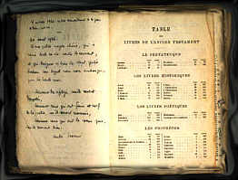 The bible here belonged to Andre Trocmé. His handwritten inscription in French reads, in part, 'Happy are those hungry and thirsty of justice; for they will be satisfied ..' |